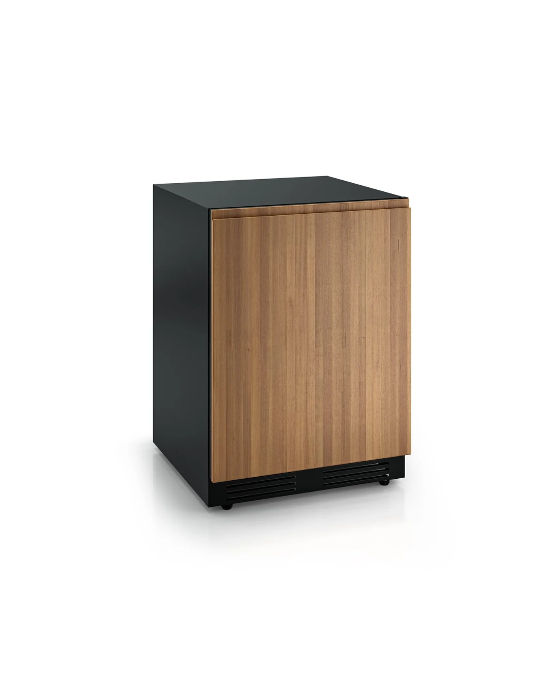 Escolha o acabamento e puxadores que desejar ao revestir a porta da adega, criando um embutimento perfeito e alinhado com a frente dos móveis do ambiente, sem necessidade de frestas laterais para ventilação.