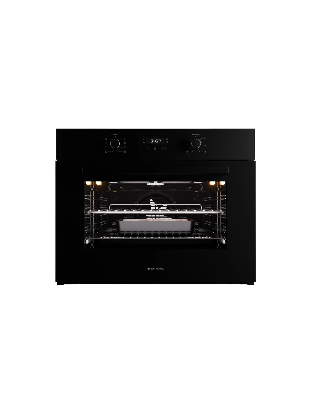 Forno Vetro Multifunção – design moderno refletido no acabamento em vidro temperado preto. Possui porta com vidro triplo, cocção elétrica, grill elétrico e timer digital com três opções de programação. Com ventilador de convecção, potencializa a circulação do ar quente e agiliza o preparo e a distribuição do calor dentro do forno uniformemente.