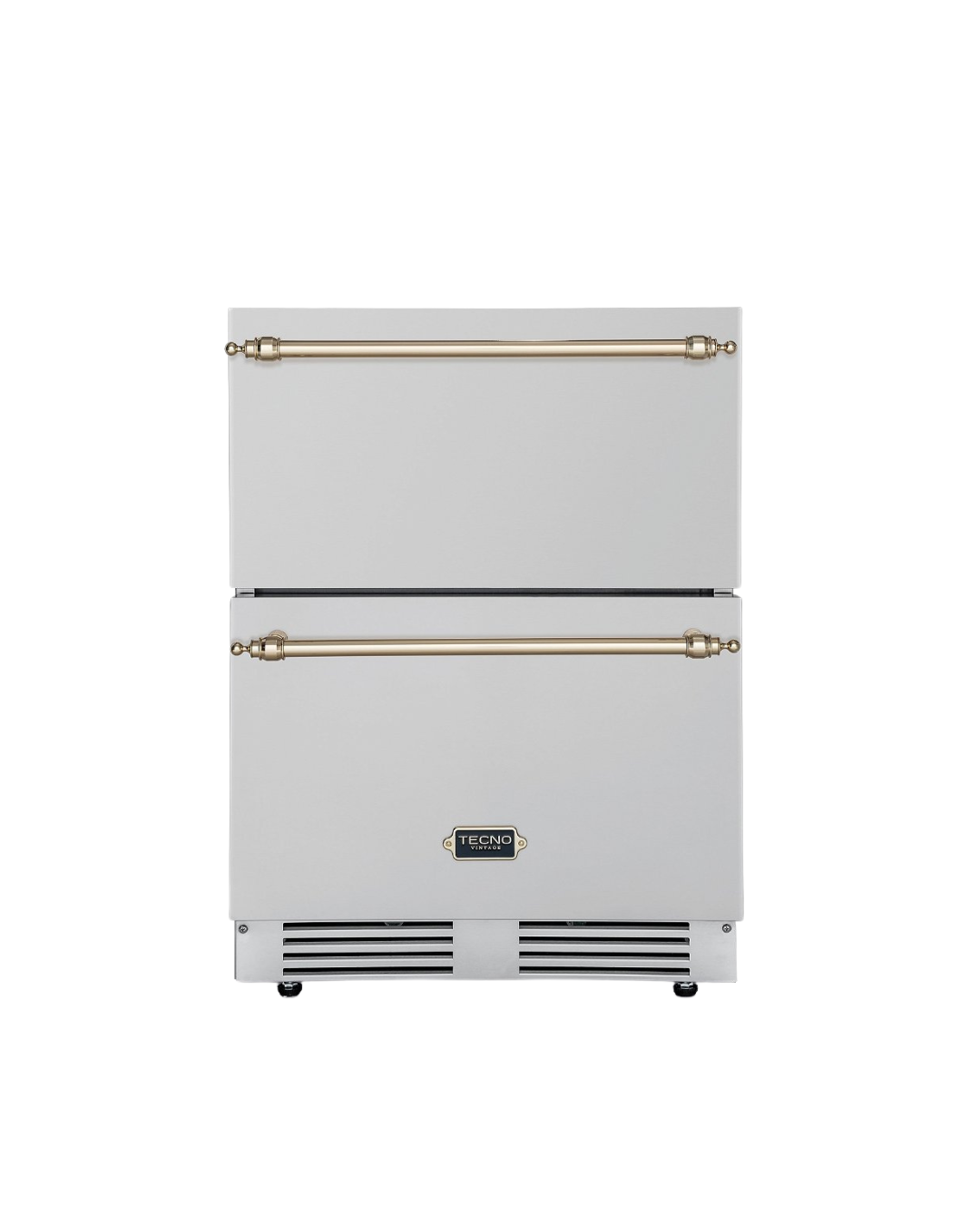 A gaveta refrigerada TR10GFXDV2 compõe elegantes conjuntos com os demais produtos da linha Tecno Vintage com os mesmos puxadores tubulares em latão polido.