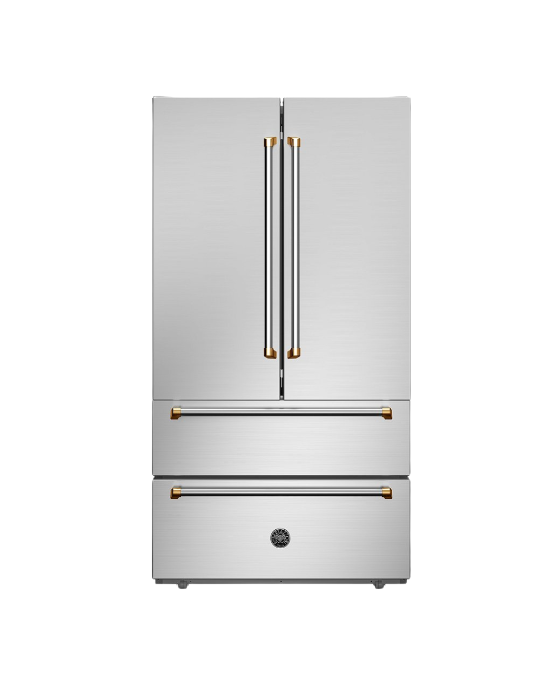 Refrigerador French Door com a maior capacidade interna de sua categoria no Brasil* de 636 litros com portas e gavetas revestidos em aço inox anti-manchas, que compõe conjuntos completos com os demais produtos da linha Bertazzoni Master Series com componentes banhados a ouro em sua cozinha.