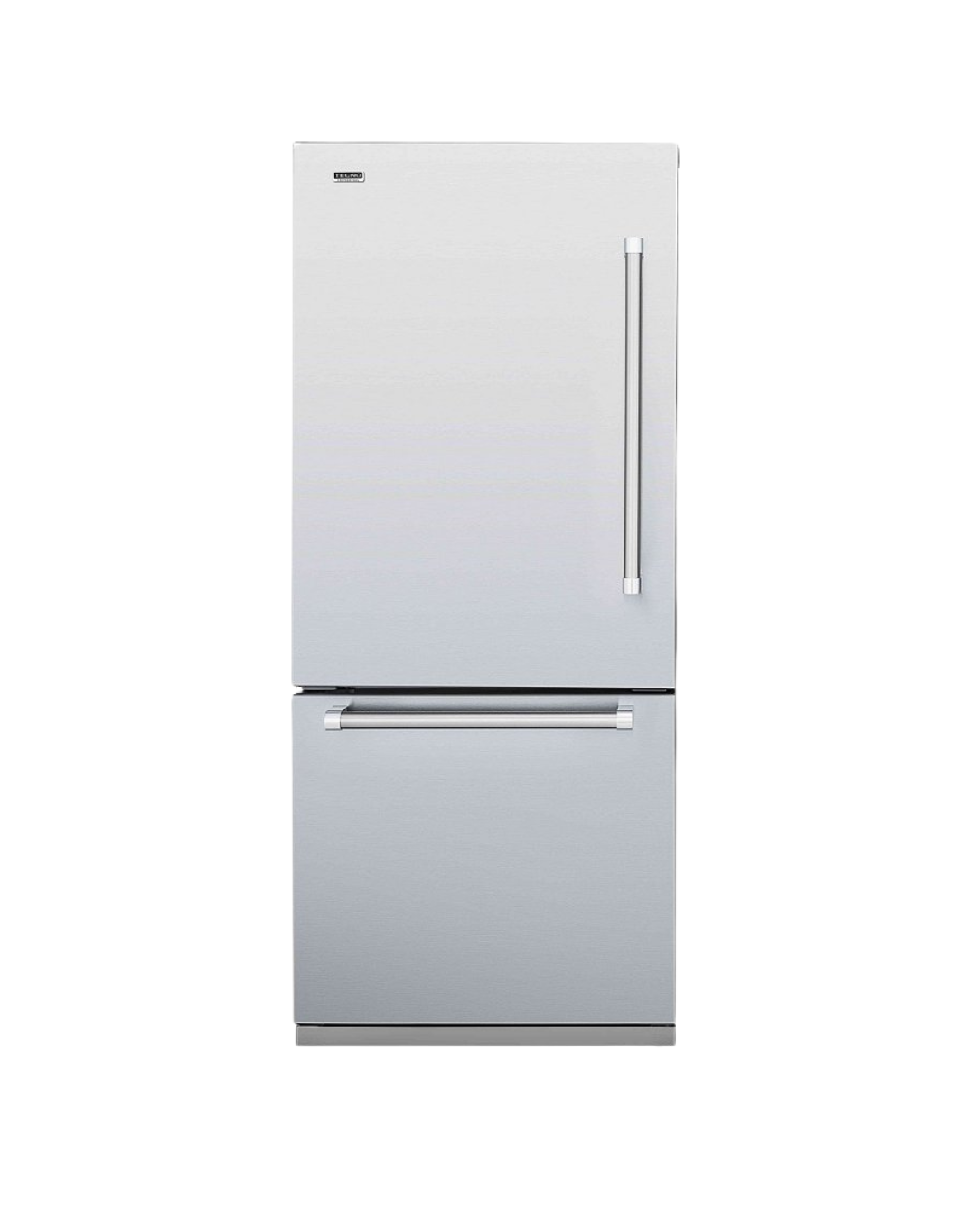 Bottom freezer em aço inox escovado anti-manchas com robustos puxadores tubulares que proporciona uma perfeita integração no piso ou embutido nos móveis de sua cozinha planejada, sem necessitar de frestas de ventilação.